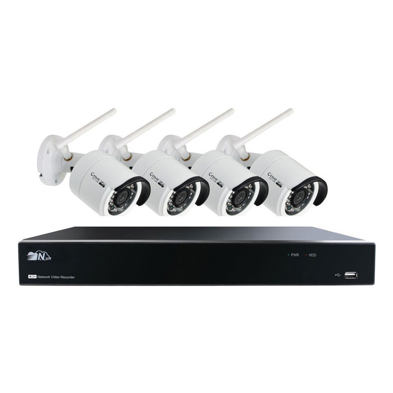 1 x Enregistreur Wifi 8CH, 4 x Caméras Bullet 2MP, 4 x Câble rallonge alimentation, 5 x Alimentation 12V